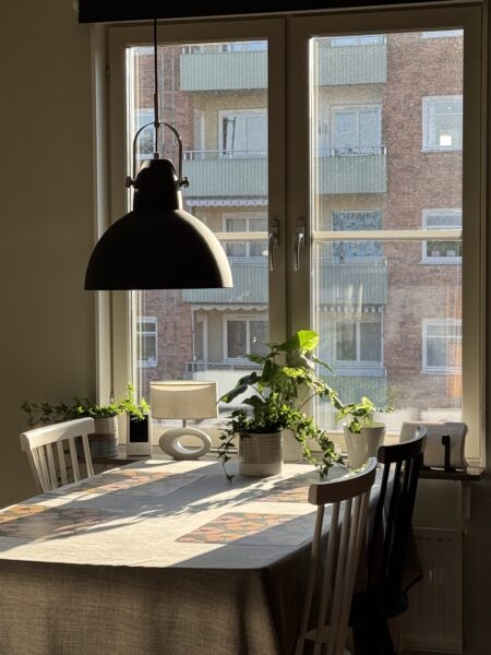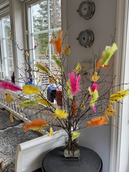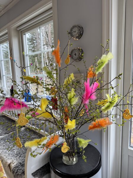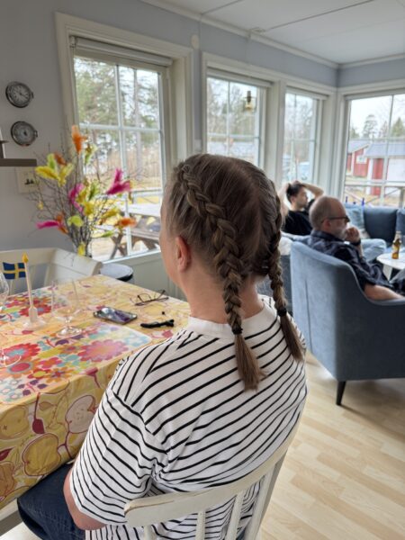 Vi vaknade till ett tyst och lugnt hus. Det vi inte visste, eller hörde, var att Noreen gått upp tidigt för att förbereda dagen. När vi kom ner till undervåningen så hade hon redan varit ute och handlat. I köket stod beviset i form av vackra tulpaner och påskliljor och på köksön stod födelsedagsmuffins med ljus och svenska flaggor.