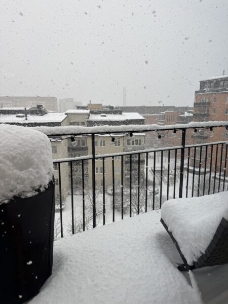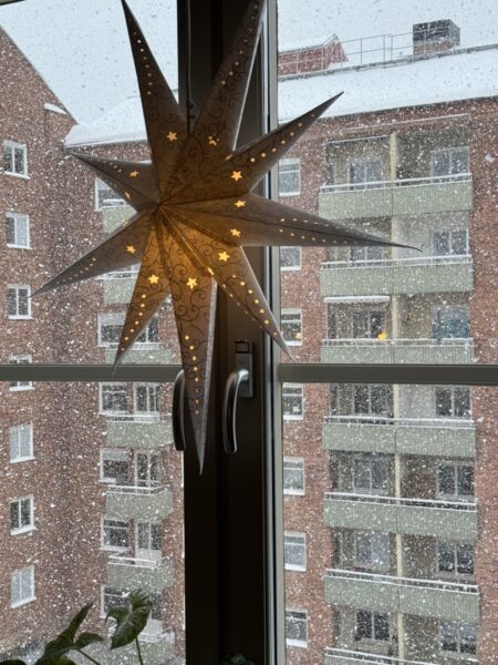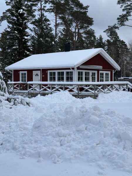 Han funderade en stund på hur han skulle såga för att inte skada vedförrådet eller sig själv. De väger ju rätt mycket såna här grenar och de vill man inte ha över sig. Den här grenen hade sin tyngsta del mot havet och själva ”ruskan” låg ovanför vedförrådet. Jag hjälpte till på det sätt han bad mig (höll i lite här och var, samt bar bort de delr som sågades bort) och sen var grenen borta. Ingen människa eller egendom skadad 🙂