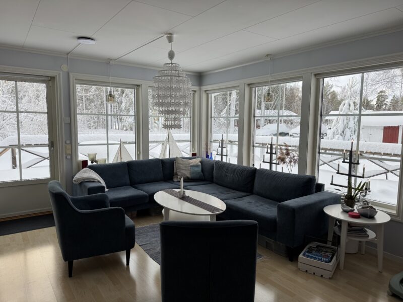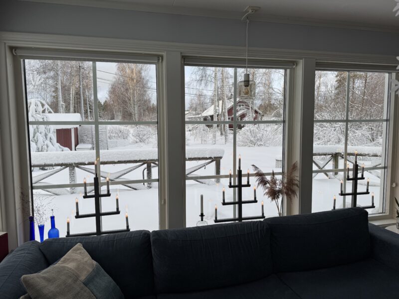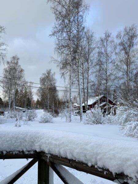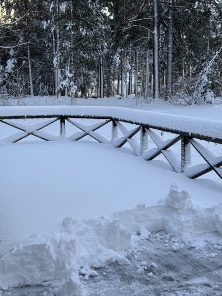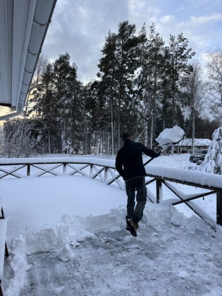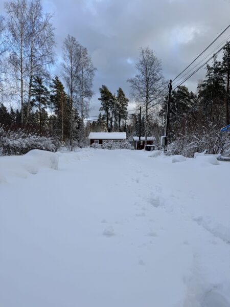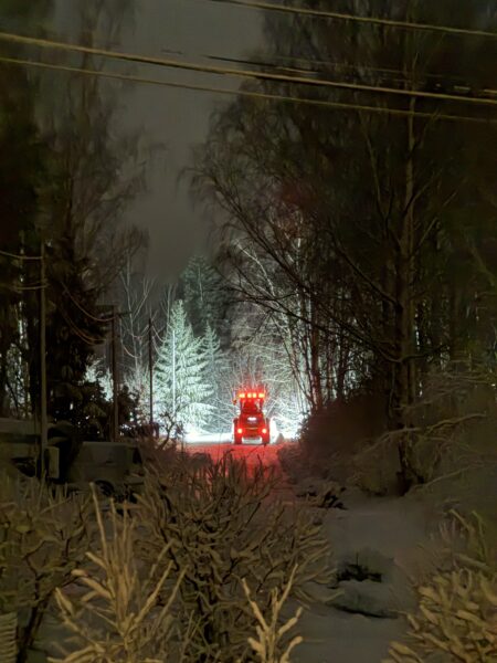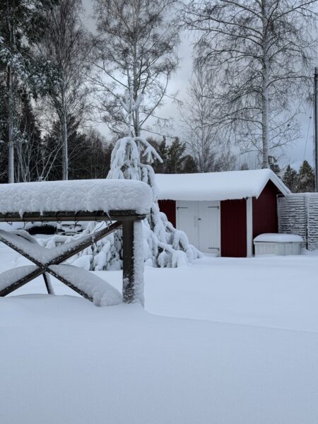 Jag pulsade sedan upp igen till huset och såg hur grannarna, Jenny, Anders och deras dotter Mathilda, skottat sig fram ur huset och nu gav sig av in mot stan. Vi har kontakt under deras resa och det verkar gå långsamt (med omvägar pga fallet träd) men säkert, hem mot staden.