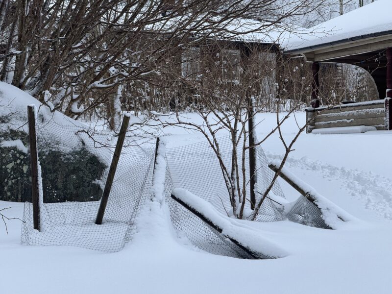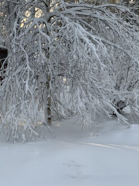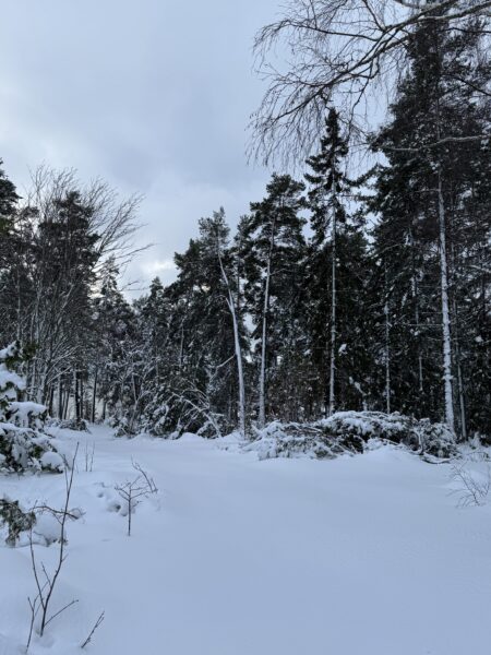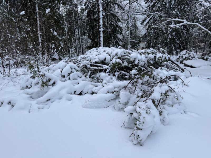 Överallt låg det tallgrenar som fått ge upp för den tunga snön.