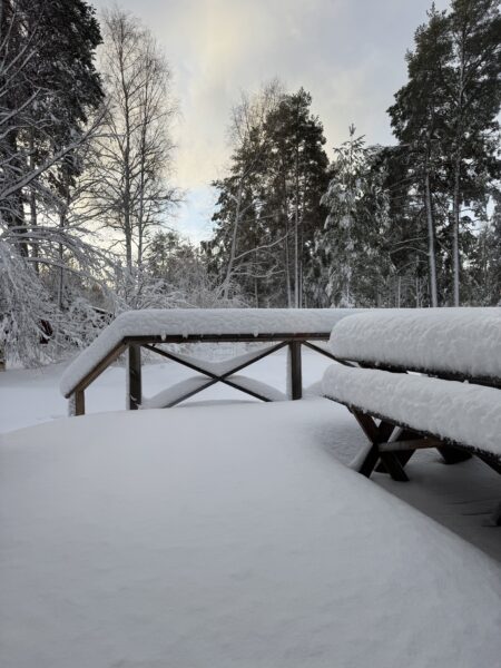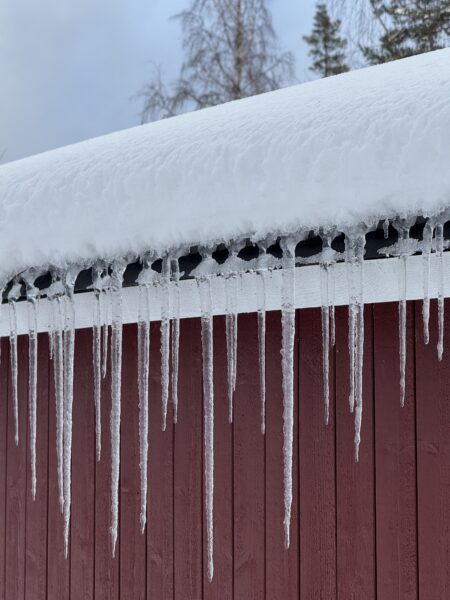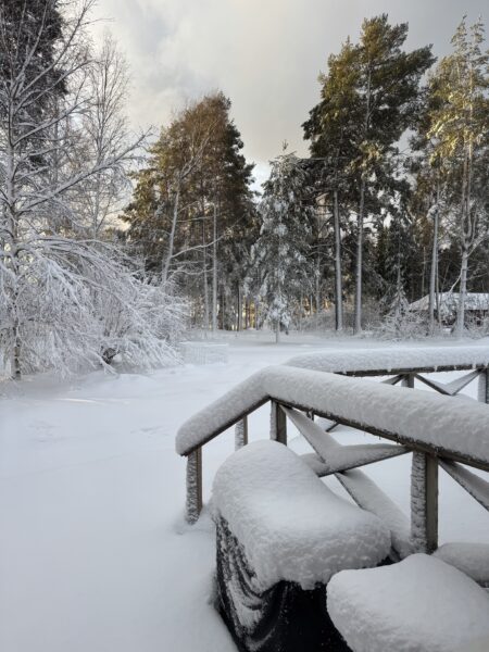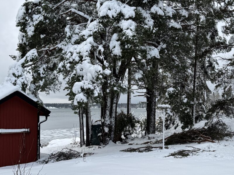 Per tog dock en tur längs med stranden och sa att det var som plockepinn. Överallt låg det stora tallgrenar som sett sin överman i väderguden. Vi såg dock inga stora skador. Bastun och vedförrådet har fått känna på tallgrenar och en grannes inhängnad runt ett träd har av någon anledning fått nog.