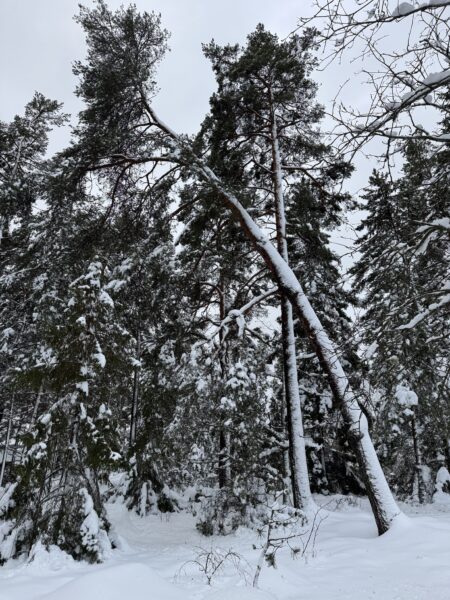 På stigen ner från grusvägen mot vattnet såg jag tydliga tecken på att även enar och tallar tycker att snön är lite i väl jobbigaste laget.
