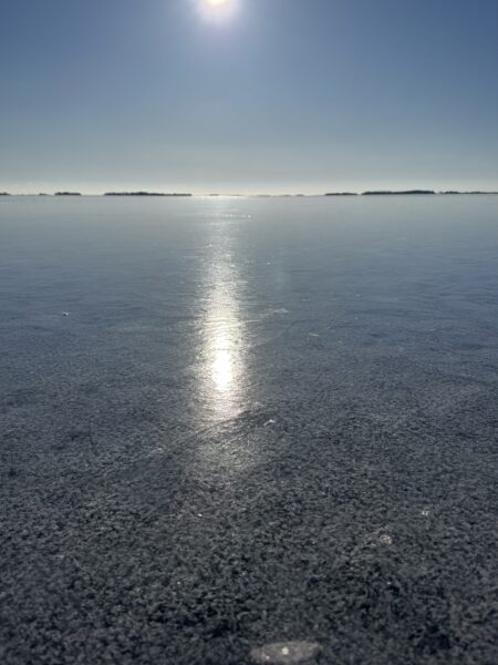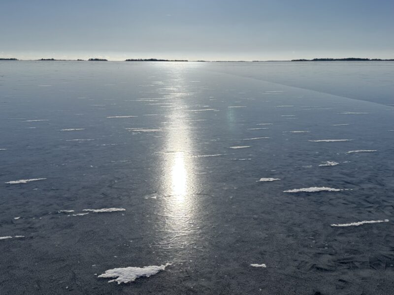 Isen på fjärden nedanför vårt hus ligger stadig och blank.