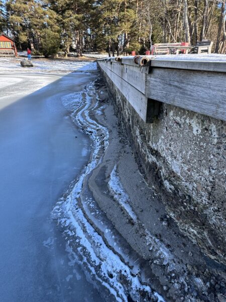 Inne vid stranden är det också lite läskigt att se hur lite vatten det finns kvar i Östersjön. Vid bryggan där båtarna brukar ligga har vi nu en liten sandstrand istället.