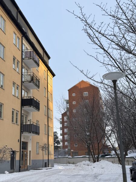 När jag stod och väntade på att Per skulle köra fram bilen för att skjutsa mig till jobbet (ont i höger knä) så kunde jag se hur solen sken på vårt hus. Underbart!