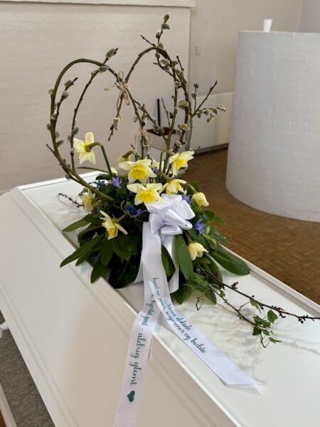 De hade skapat kistans blomsterarrangemang av blommor och andra växter från sina egna trädgårdar. Mycket personligt.