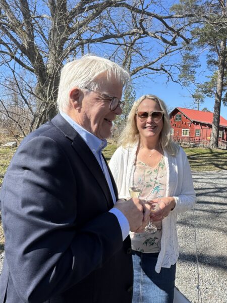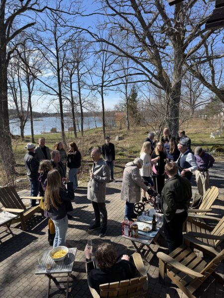 Vi minglade därför utomhus en lång stund medan vi bjöds på champagne och löjromstilltugg.