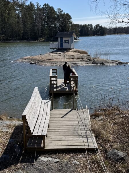 Efter maten utforskade vi området litegrann. Här ser ni hur min syster Susanna och hennes son Noah tar en liten linfärja ut till badholmen.