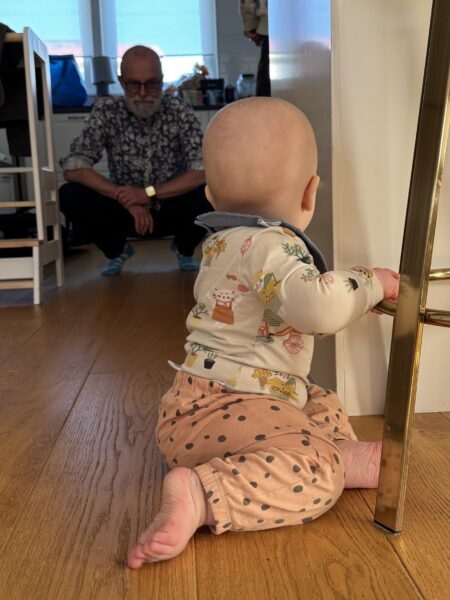 Alfred lekte med vad som helst som han fick tag på. Han ville väldigt gärna leka med Elsas vattenskål, men då den flyttades utom räckhåll fick det bli en barstol och farfar.