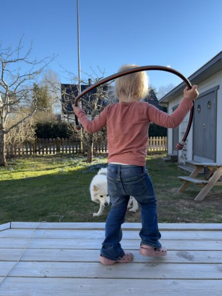 Vera lekte med samojeden Elsa och någon form av kopplingsslang till vattenslangen, så jag insåg att leksaker inte alltid behöver vara tillverkade för lek.