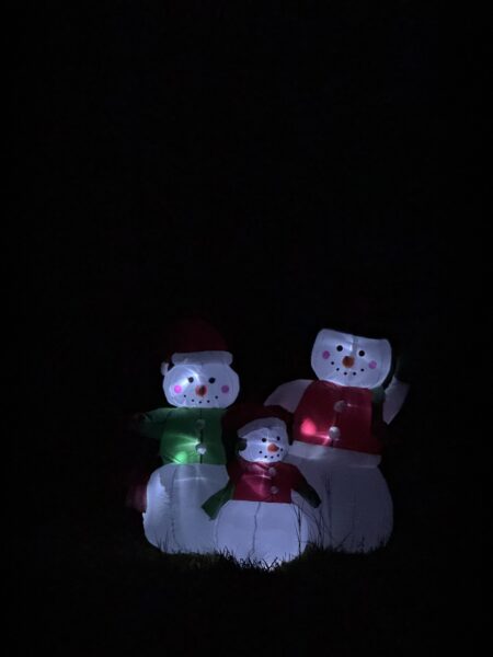 Från ”stora vägen” gick vi sedan med varsin pannlampa för att hitta hem. Vi möttes av tre snögubbar som vår granne Mattias ställt fram 🙂